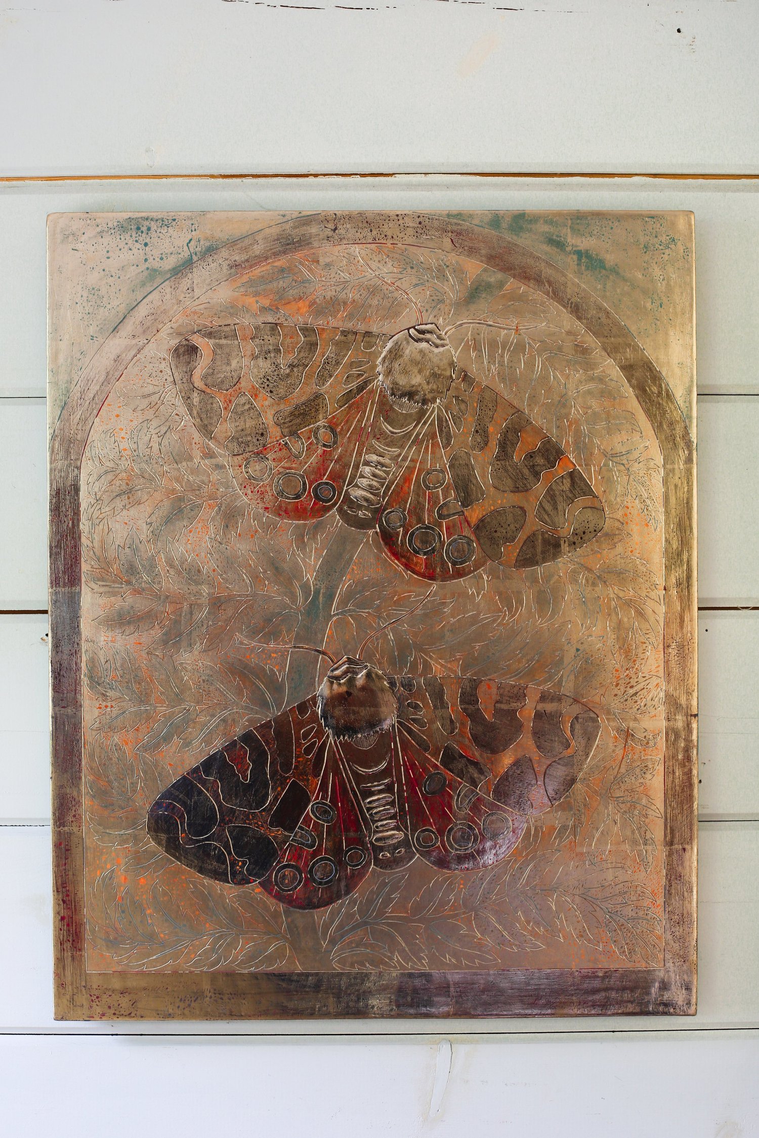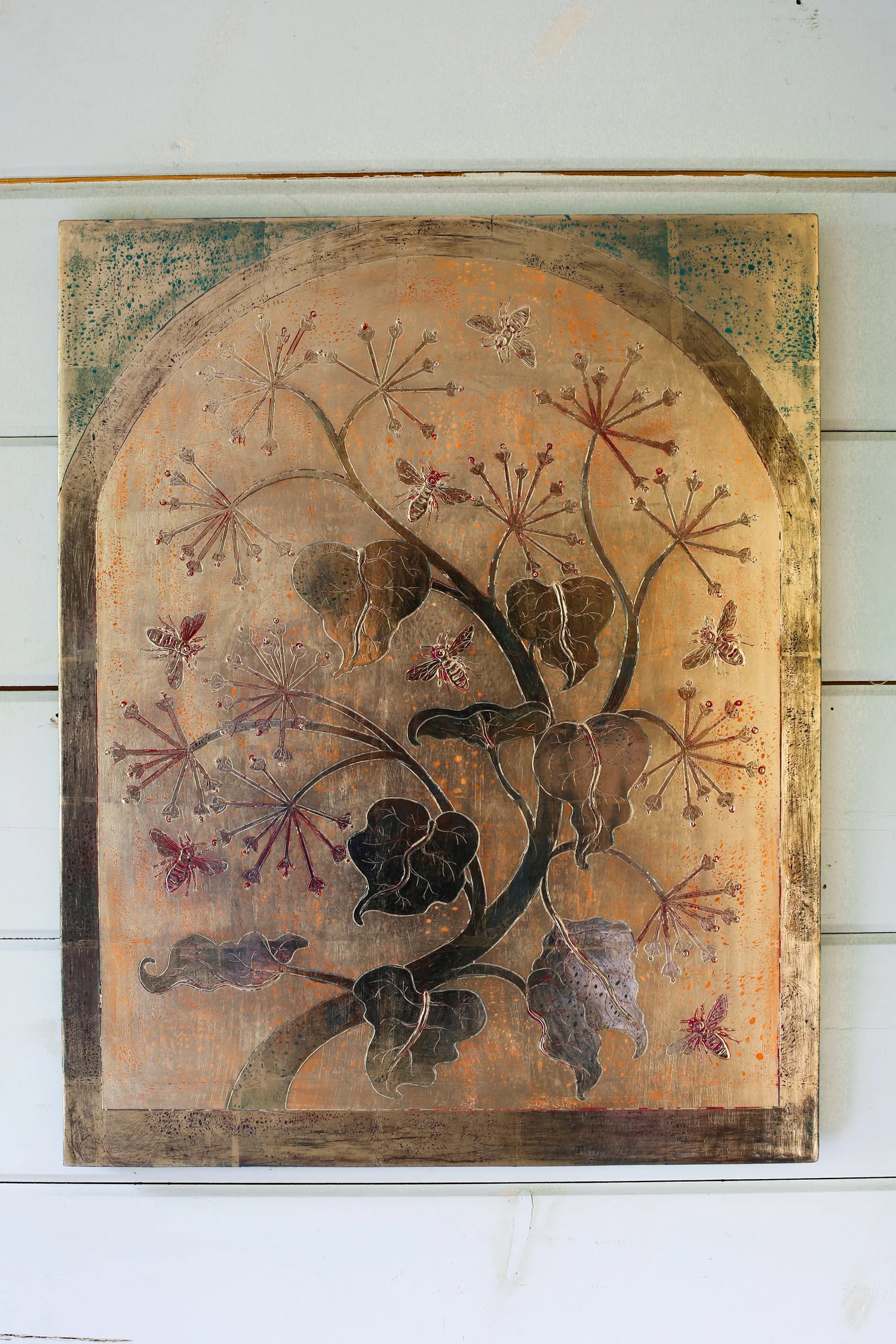 Large Dutch metal bronze leaf and stained glass ‘Folium’ panel.
